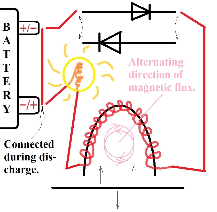 The other half of a DC transformer experiment is to put two diodes in the middle of a double-pole, double throw switch inline with one lead coming off the PMH coil/s and the other lead that goes to the battery during charge. The other lead from the PMH coil/s could go to the light bulb and thence toward the other battery terminal during the charge cycle when these two bare battery leads are not bound together during discharge (which also lights up the light bulb). The light bulb lights up twice: during both charge and discharge.